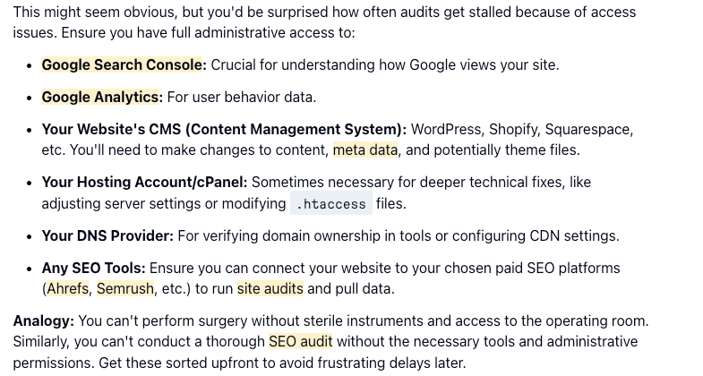 Now, here's the primary issue with this draft: it doesn't target a specific audience skill level. The draft includes top-level analogies that could be used to explain SEO audit concepts to an extremely beginner audience, but then also says that the reader must have access to very technical tools.