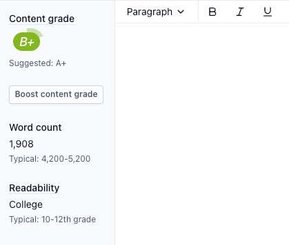 The draft didn't get a great Clearscope score for SEO purposes, either. It's missing some key semantic terms and uses more complicated sentence structure than is necessary.
