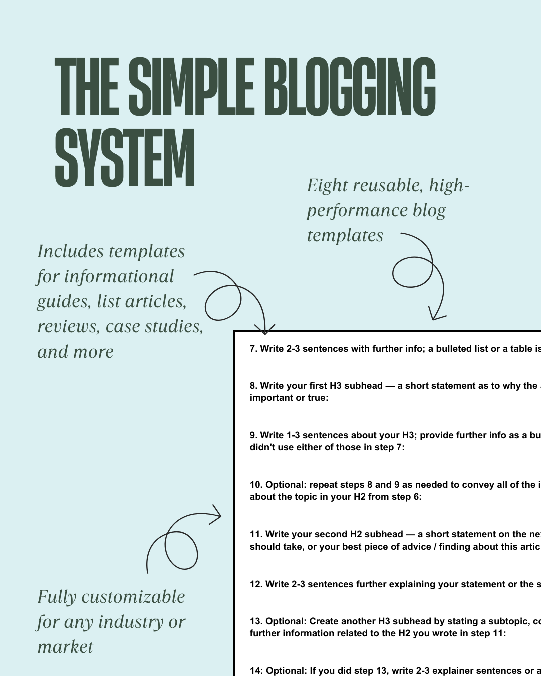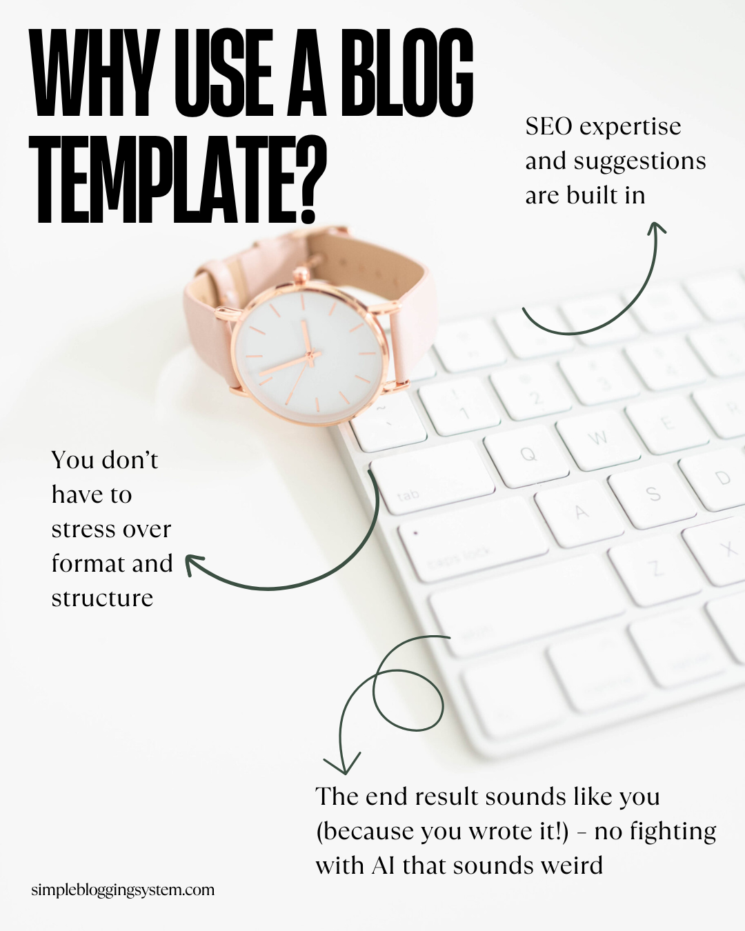 The Simple Blogging System is a straightforward, repeatable, and customizable framework that helps you create optimized blog posts in a single afternoon. And the best part? It's all written by you, so it sounds like you.